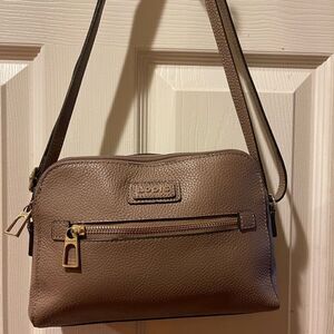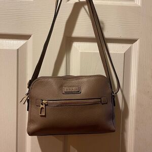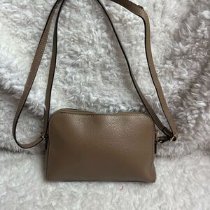 Lodis leather tan crossbody bag with gold tone hardwares adjustable strap.