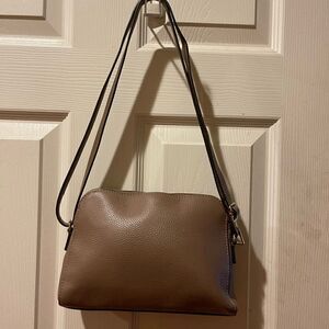 Lodis leather tan crossbody bag with gold tone hardwares adjustable strap.front zipper pocket top zipper the inside lining has a side pocket.pre owned in good used condition