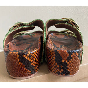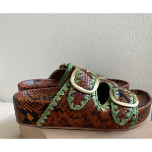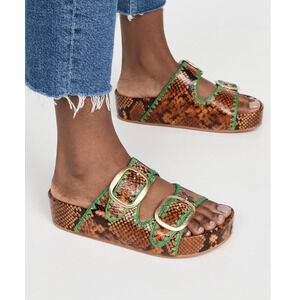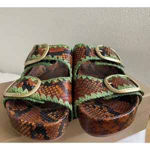 Stylish snake print sandals. Features double buckle design. Comfortable platform sole.