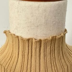 Loeffler Randall camel ribbed knit top in a slim fit mock neck style. Long sleeve neutral beige sweater shirt made of cotton nylon blend. Minimalist designer piece perfect for layering, chic basics, or pairing with jeans, skirts, or trousers. Classic wardrobe staple for fall and winter, timeless neutral top in size medium