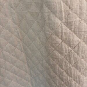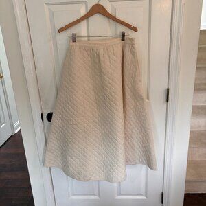A-line skirt in cream cotton. Features a quilted texture, pockets, a zipper closure, and a smocked elastic panel on the back of the waist for a snug, comfortable fit.