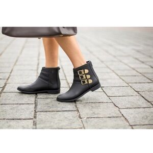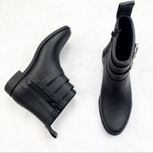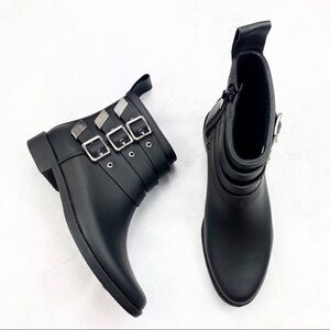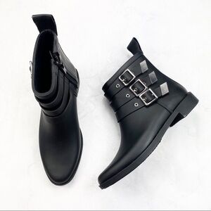 Loeffler Randall Classic Black Fenton Rain Boots. Round Toe. Adjustable Silver Buckle Straps. Side Zipper. Pull Back Tab. Leather / Rubber Material. Super Cute & Comfy. NWT / New With Tags. No Stains or Rips.