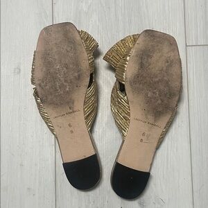 Take a star turn in classic Hollywood style wearing this square-toe slide sandal featuring a bow-tied gold-lamé strap. Only worn once, purchased new.