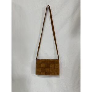 Loeffler Randall 'Delphine' Brown Clutch Bag: woven suede exterior with twill lining, flap top with brass-tone push lock closure, one main compartment, interior slip pocket, detachable shoulder strap.