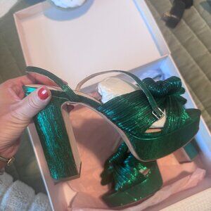 Elegant emerald green platforms with a chic bow design. Perfect for elevating any outfit.