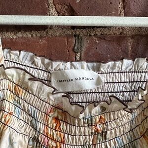 Excellent condition, only worn a few times! This is from a Loeffler Randall sample sale, so I don’t believe it was ever sold by the store. Ruching across the entire top. The front waist has a drawstring to adjust synching. The back waist is elasticated.