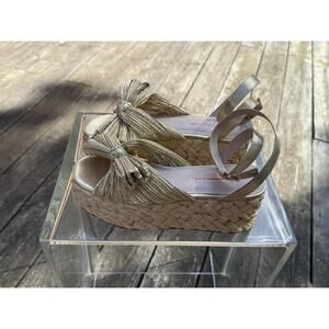 Loeffler Randall Gaby Gold Pleated Bow Espadrille Sandals Ankle Wrap Platform 7