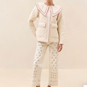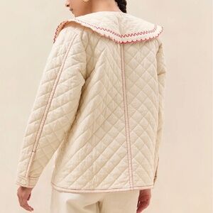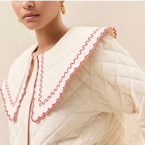 Workwear-inspired jacket in natural heavy quilted cotton with poppy red topstitching. Features flower-shaped buttons at the front, a pointed collar with scalloped edge, and a slightly boxy fit.