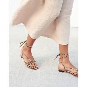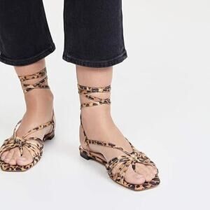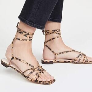 Loeffler Randall Lorelai-N Wrap Sandal in Leopard Print. Size 6. Features square toe, flat heel, strappy leather upper, leopard print, and ankle wrap closure. Excellent pre-owned condition.