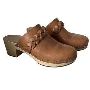 Wooden mid-heeled clog with studded detailing and braided decorative strap in rich cognac Italian vachetta leather. Clog Sandals Round, Closed Toe Studded Detailing Braided Strap Padded Footbed Heel Height: 2 in. | Platform Height: 1 in. Upper: 100% Leather | Outsole: 100% Rubber