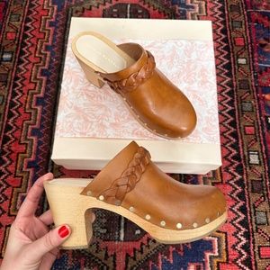 Wooden heeled clog with studded detailing and braided decorative strap in cognac brown vegetable-tanned Italian vachetta leather. Padded footbed with gold stamped logo. Round toe, slips on. 3.25 inch heel.