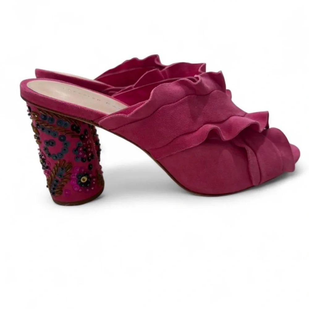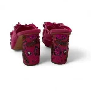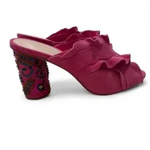 Raspberry ruffle mule with layered fabric upper. Embellished block heel with bead and sequin floral details. Slip-on style for easy wear. Feminine and statement-making.