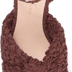 Crinkled fabric cover a statement-making sandal topped with a bow and set on a towering heel and platform.