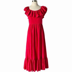 Keywords: Loeffler Randall dress, red ruffle midi dress, romantic summer dress, cotton blend midi, USA made designer dress, cocktail party dress, wedding guest outfit, boho chic style, statement neckline dress, elegant resort wear