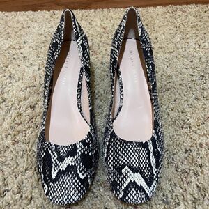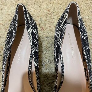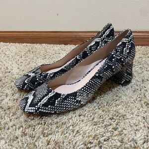 Loeffler Randall Snake Heel Pump Ina. Snakeskin animal reptile print. Round toe. Block heel. Black and white neutral colors.