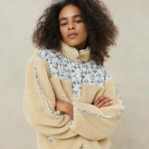 - Pullover in cream fleece with blue wavy ditsy floral trim. Features a mock neck, elastic at the sleeve openings, and an oversized, boxy fit.