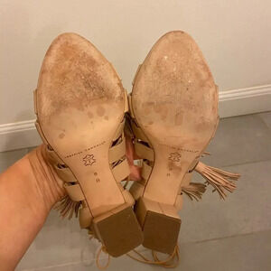 Loeffler Randall Tasseled Lace Up Leather Sandals Wheat Tan Size 8. Good pre-owned condition. There are some scuffs and markings on the block heels, wear to the soles and insoles. The insoles have foot petals. A small dark mark on one side near the foot bed.
