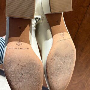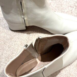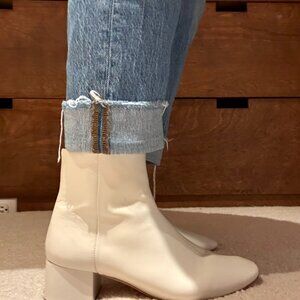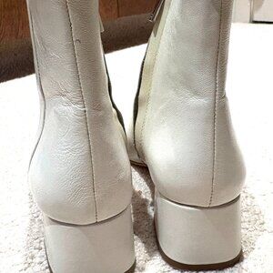 Soft white leather zip-up chelsea boots from Loeffler Randall. Worn a few times with some superficial wear, slight discoloration around the seams. Otherwise in excellent pre-worn condition.
