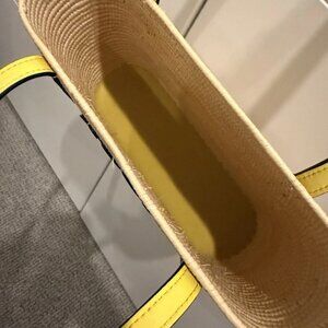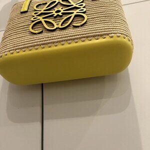 Crafted with an eye for timeless elegance, the Loewe Anagram Mini Square Raffia Basket Bag presents a chic top handle design, perfect for those seeking a blend of sophistication and practicality. Its woven raffia exterior, in a versatile beige hue, is complemented by a soft yellow leather strap, adding a subtle pop of color to this petite accessory.