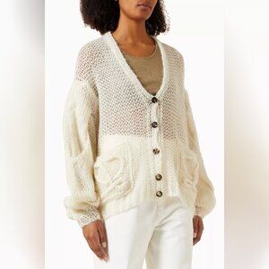 Loewe’s cream cardigan is crafted from a fuzzy mohair-blend to a delicate open-knit weave. Framed with draped balloon sleeves, this slouchy style is adorned with the label’s raised knitted logos at the front pockets and back.