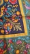 Vibrant silk scarf with intricate floral patterns. Features a mix of blue, yellow, red, and green colors.