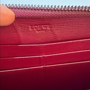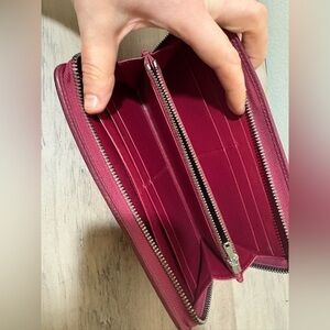 Chic fuchsia leather wallet. Includes multiple card slots and a top zip closure.