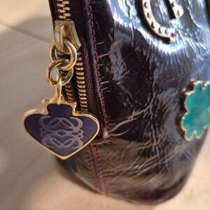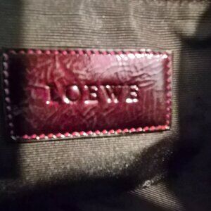 Burgundy zipper pull featuring the Loewe logo. Leather tag and stamped satin interior, which looks like it was not used