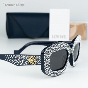 Loewe ANAGRAM LW4114IS 90A sunglasses feature a stunning shiny blue acetate frame adorned with elegant crystal studs, paired with sleek grey lenses for a modern rectangular look. Designed for women but suitable for unisex wear, they combine luxury detailing, excellent UV protection, and premium Italian craftsmanship.
