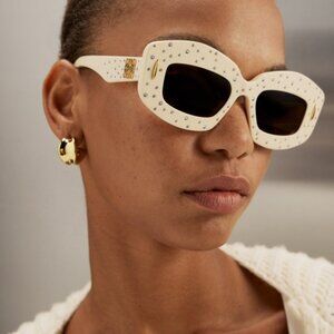 Loewe ANAGRAM LW4114IS 25E sunglasses feature a chic ivory white acetate frame embellished with sparkling crystal studs, paired with warm brown lenses for a refined rectangular silhouette. Designed primarily for women but suitable for unisex wear, they combine luxurious detailing with excellent UV protection and Italian craftsmanship.
