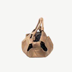 This Nappa Aire handbag from Loewe is crafted with a metallic gold sheep skin leather, and features gold-tone hardware, two top rolled handles joined into one, and an embossed anagram on the front. The top magnetic snap closure opens to a brown logo-jacquard satin-lined interior, and contains an inner zip closure, and a single zip pocket.