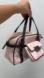 Elegant Loewe satchel in pink with black accents. Features signature logo pattern. Ideal for a chic look.
