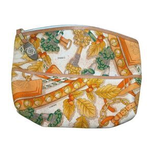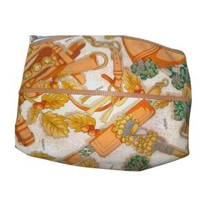 This authentic Loewe pouch features a vibrant botanical and equestrian-inspired print in warm autumn tones, crafted from durable canvas with smooth leather trim. The gold-tone logo-engraved zipper pull adds a signature touch of luxury.
