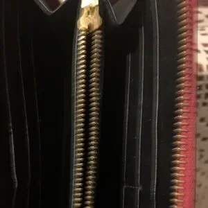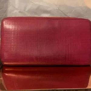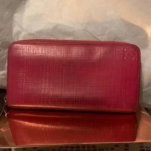 Loewe zip-around wallet in textured raspberry leather. Embossed Loewe logo on corner. Smooth zipper and clean lines for daily use. Rich, vivid color adds a statement touch.the inside zipper is missing a the pull but still works.