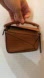 Chic mini bag in tan leather. Features a sleek design with a chain strap. Ideal for versatile styling.