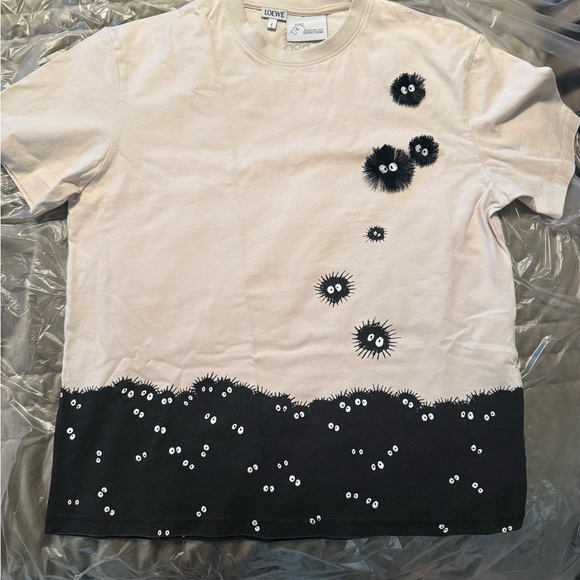 This Loewe t-shirt graphic design in cream and black. Ghibli studio LOEWE X TOTORO DUST BUNNIES T SHIRT OVERSIZED SIZE S WHITE COTTON FABRIC PRINTED 3D EMBROIDERY