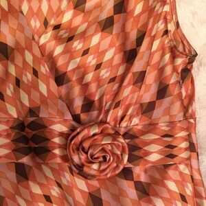 Rich tones of peach, brown and orange make this a versatile top to either wear by itself or under a blazer/cardigan. Side zipper with empire waist adorned by a rosette.