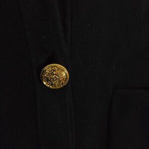 The Loft 2024 Navy Cardigan is perfect for a preppy, classic career look. It features gold button details and a ruffle collar, offering a stylish yet professional appearance. Ideal for any season, this sweater combines comfort and elegance effortlessly.