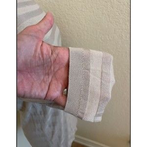 Ribbed sleeves and bottom hem. There is a tiny pull at the sem in the back of the right shoulder. Please see last pic. Otherwise great condition. Also pics show measurements. Size Large.