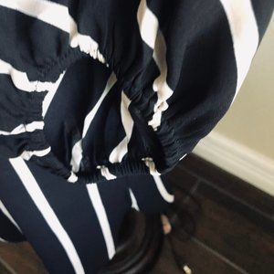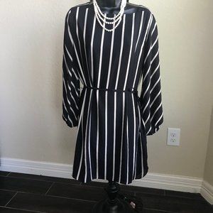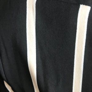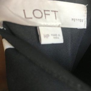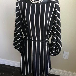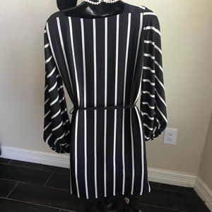 LOFT ladies dress size PM. Black with white and beige stripes. Thin tie wrap, 3/4 sleeves with elastic at cuffs, above the knee. Gently worn, no snags, no stains, comes from smoke free home.
