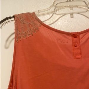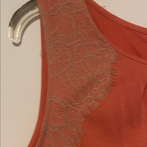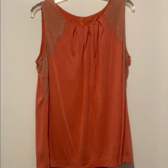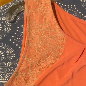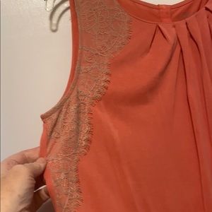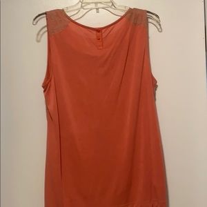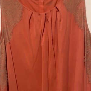 Beautiful soft coral colored top with tan lace detailing from the shoulders down to the arm hole and also carries over to the top back. Has pleats on the neckline which are very flattering.
