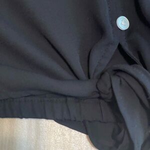 100 percent polyester, cute button and tie detail with a band at the bottom as shown . Medium loft !