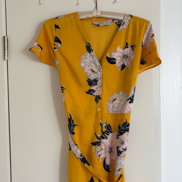 Beautiful yellow dress, floral print, v- neck with detachable belt. I’m 5’6” and it comes to about mid ankle. Button down.