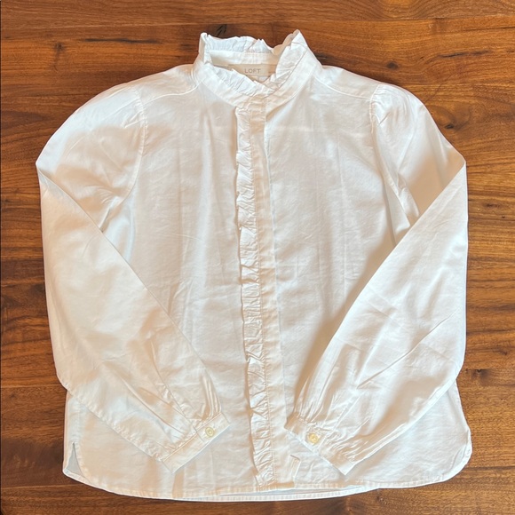 Stylish white, long sleeve, button down blouse with elegant ruffles. Perfect addition to your capsule wardrobe. NWOT