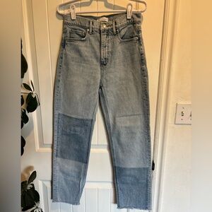 Elevate your style with these chic light blue two-tone jeans. Perfect for any casual outing. High rise ankle straight leg jeans. It's the genuinely awesome fit that sits at the true waist and is super easy fitting from the hip to mid-thigh. Ankle inseam on comfort stretch denim accented with 3D hip whiskers at hip and light pocket & hem grinding.