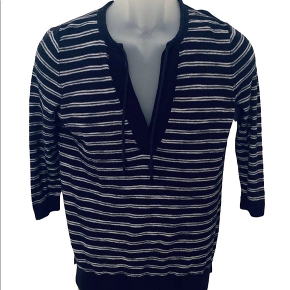 This is a beautiful LOFT by Ann Taylor navy blue & white striped pullover sweater, women's size PM, in pre-owned but great condition. The sleeves are 3/4 and there’s a drawstring in the front. Just add a white tank top underneath and you’re good to go!