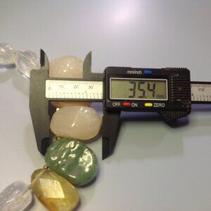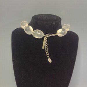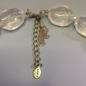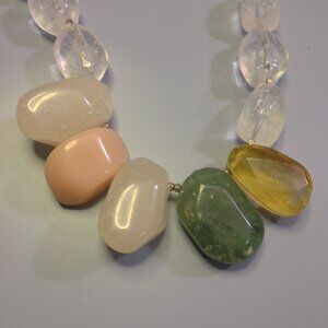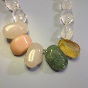 Lovely 18" Beaded Necklace from Loft *Ann Taylor, circa 1990s. Large pebble like beads with separators, 14 are like crystal clear Chunks of sugar and 5 are intentionally shaped, multicolor pastel. There is a jade-like green, a faceted amber, a peachy pastel and two that are like drops of cream sickle or tapioca. The final mile is silver chain holding a "diamond" chip on a "Loft" branded silver tag and a small chainmail tassel. Excellent condition.