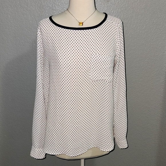 LOFT Ann Taylor long sleeve polyester Navy and Brown Polka Dot Blouse Size Small with pocket.