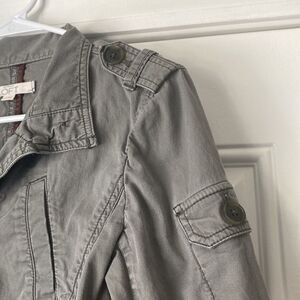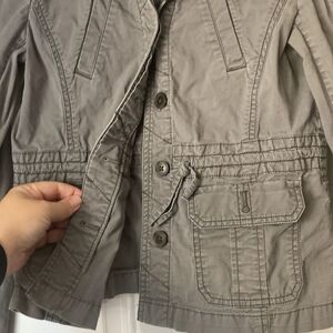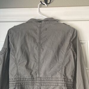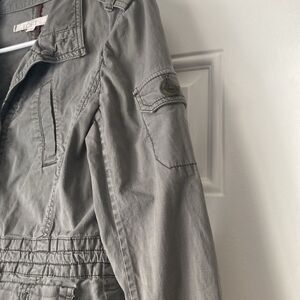 Draw string waist, button accents on shoulders, pockets on sleeves, and front, GUC, soft, slight stretch, lightweight