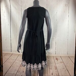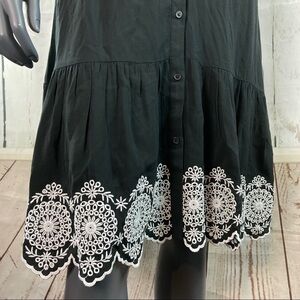 This is a black and white dress that is brand new with tags still attached. Solid black with buttons down the front and a tie ribbon belt as well as pockets and a collar. The bottom trim has white beautiful detailed embroidery. 100% rayon