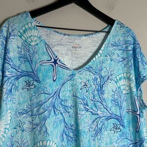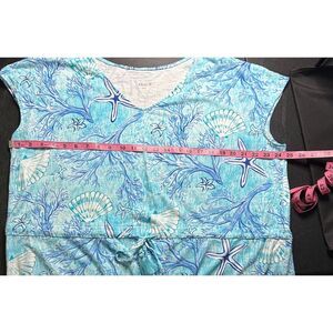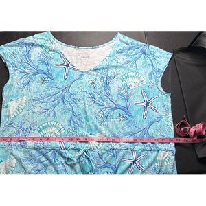 Sea life print dress from Loft Beach. Blue and white print with shells, coral, and starfish. Adjustable waist with drawstring. Pom Pom trim. Size 1X. See photos for measurements. Good preowned condition with no tears, stains, or picks.